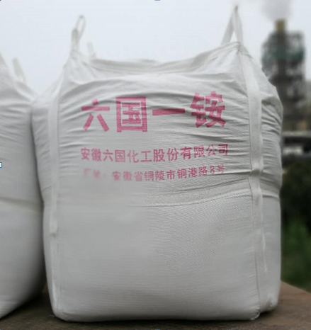 3、印刷字样:吨袋前后写上”六国一铵”四个大字,下面写上厂址,字体颜色为红色字体。
