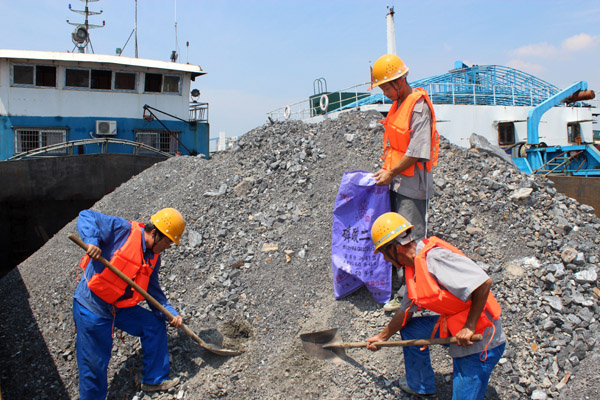 图二:7月23日下午,室外气温高达40℃,取样人员正在5#码头到港船上取磷矿石船板样。