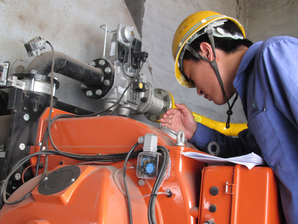8月5日,六国化工公司复合肥车间装置检修重点技改项目——干燥窑热风炉“燃煤改燃气”技改试点火一次性成功。改造后的燃气热风炉采用智能控制,操作安全稳定,热效率高,经济环保。图为该车间技术人员正在观察热风炉内燃烧情况。