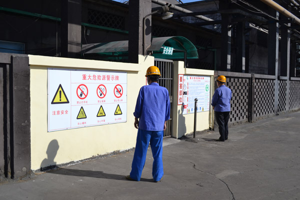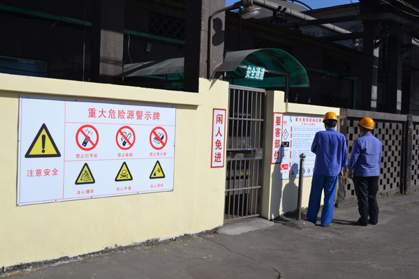 图为该车间员工在辨识重大危险源告知牌。