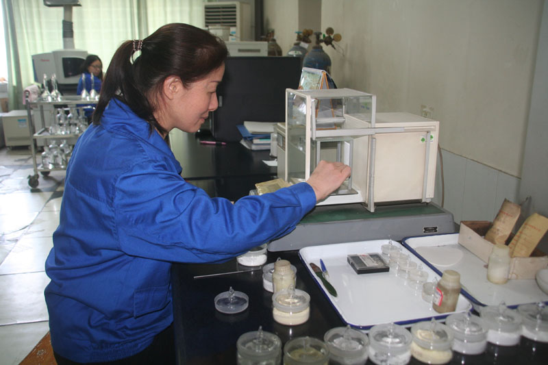 1月份以来, 六国化工公司也先后签订了出口南美的55%粒状磷酸一铵合同和出口韩国的61%磷酸二铵合同,两项产品均为散装出口,其中55%粒状磷酸一铵6000±10%吨,61%磷酸二铵3500 ±10%吨。自3月4日起,该公司组织好产品的连续生产、质量检验和按时装运外发工作。图为3月10日上午,该公司检验中心员工正在检测55%磷酸一铵出口产品的质量指标。 ( 陈 沐)