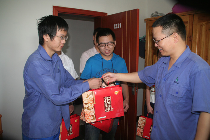 图:六国公司党委副书记黄明强为来自清华大学的蒋良虎送上月饼。