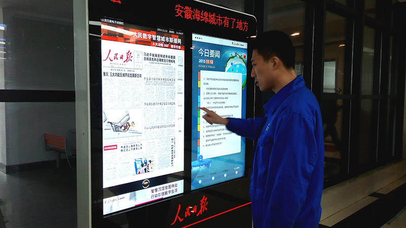 日前,一台《人民日报》电子阅报栏落地六国化工公司弘毅楼食堂内,吸引该公司员工们点击阅读。