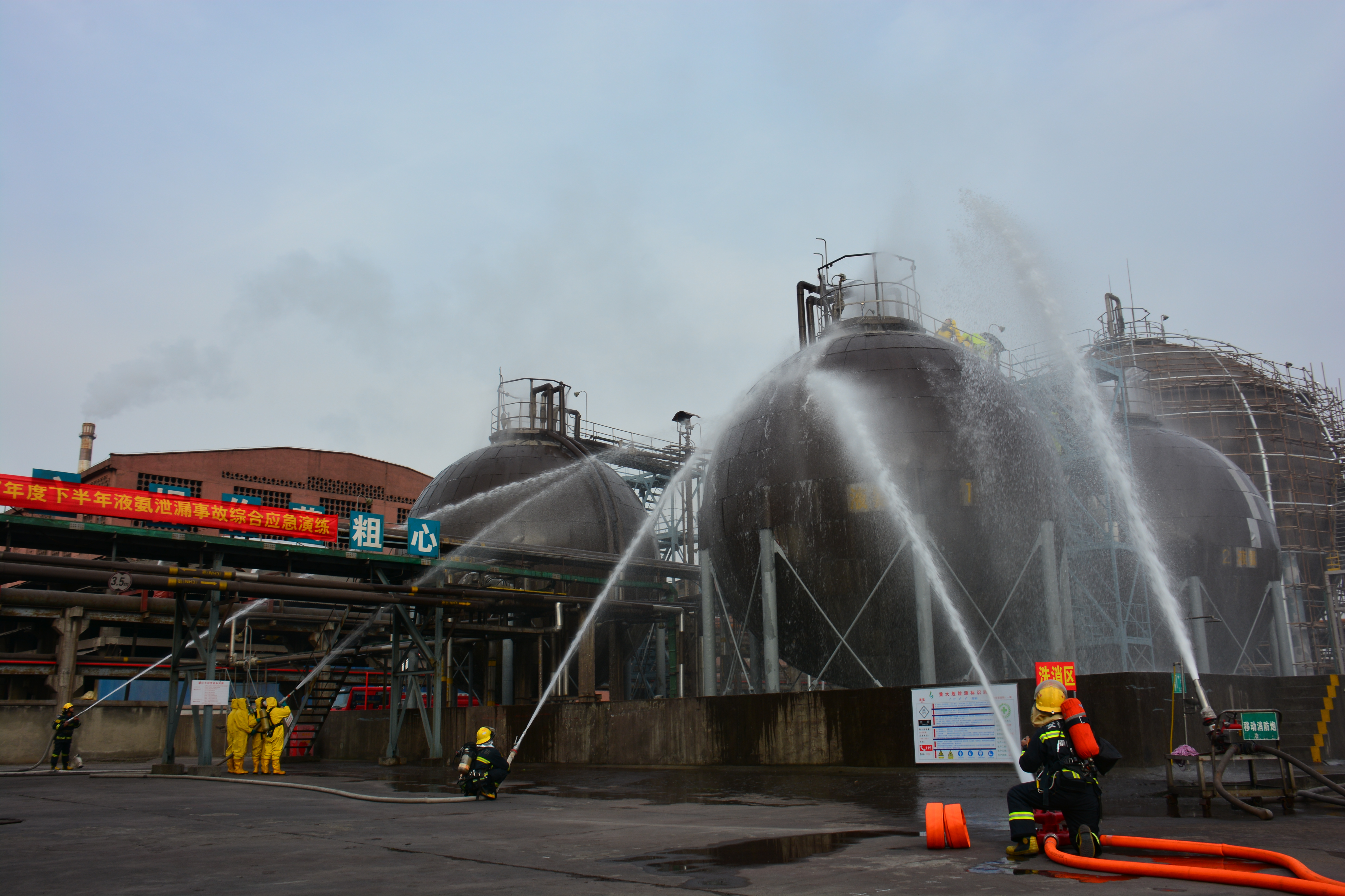 图为11月24日,六国化工公司在罐区车间液氨球罐区开展下半年公司级事故综合应急演练。