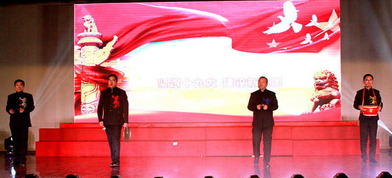 图3、图为在六国公司迎春联谊会上,4位基层支部书记(副书记)正在表演三句半节目《紧跟十九大 建设新六国》。