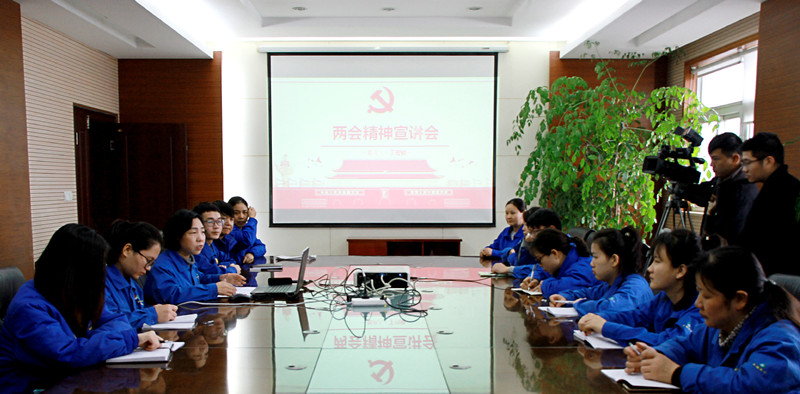 图为全国人大代表丁宏锁(左三)为公司青年员工宣讲两会精神