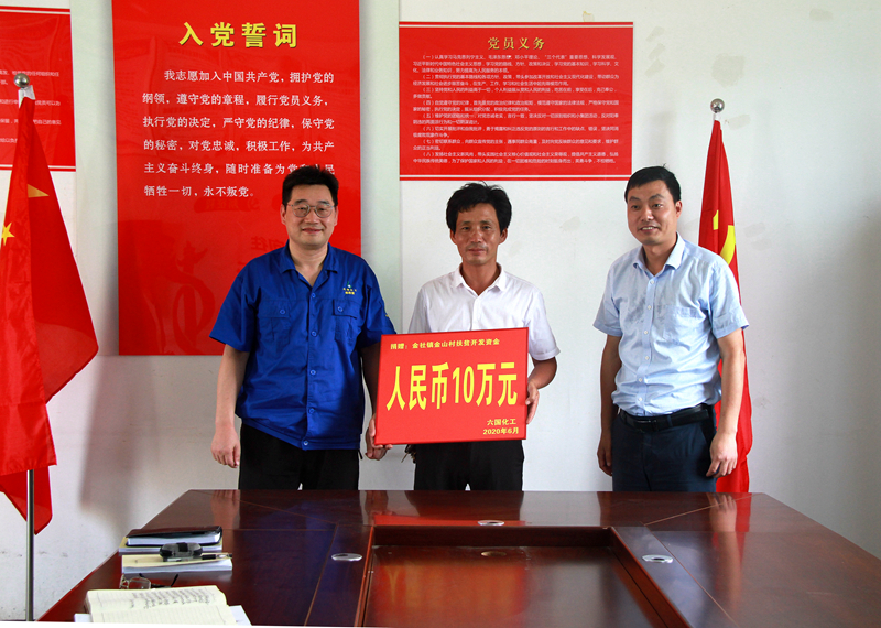 6月17日下午,六国化工公司董事长、党委书记陈胜前、党委副书记吴健一行前往结对帮扶对象金山村,召开2020年二季度联合党委会,并向该村捐赠10万元扶贫开发资金,金社镇党委副书记左长红参加了会议。